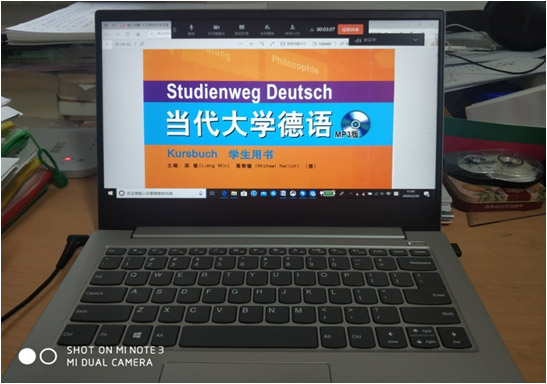由于疫情,不能正常返回学校上课,但是按照外语学院的指示,停课不停学。要求老师们在电脑上进行钉钉直播,一下子变身在线主播了,沈老师的心情还是比较激动的。由于之前从来没有接触过直播,他觉得压力山大。于是,在直播前进行各种测试,并在德语系建了一个交流学习群,在群里面大家都畅所欲言,交流人生的第一次直播经验,从声音是否清晰、画面是否清楚、如何连麦等等,发现问题大家共同解决。经过两周时间的准备,感觉得心应手了许多,也日益发现钉钉这种新事物对于教学上的帮助。