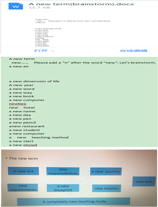 从学生在线编辑的内容和之前发给学生的ppt课件对比,学生没有很好预习,写的单词过于简单,没有写出ppt课件中出现的具有时代性的这些词组,“新时代、新担当、新征程、新要求、新蓝图、新使命、新作为”,再到今天的“一种全新的教学模式”。