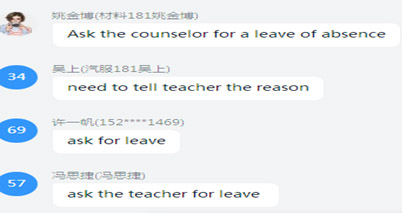本课堂规定,一旦学生因病或因事请假,必须事先提交英文的请假条,或事先告知,事后补交英文请假条。在了解学生的答案后可以再次强调该规定。