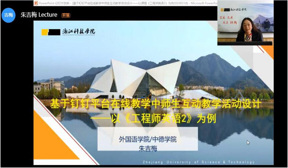 朱吉梅分别从现实背景、理论基础和实践操作三个方面层层递进,梳理了新冠肺炎疫情期间上级教育主管部门和浙江科技学院发布的一系列文件,指出在当前疫情突发且持续的背景下,采用线上教学方式是实现“离校不离教,停课不停学”的必然选择。同时引用多篇文献介绍互动教学的理论基础、方案和方法。朱吉梅认为基于互动教学理论的钉钉平台能够帮助教师及时掌握学生课堂表现,提高教学互动的有效性。朱吉梅以《工程师英语2》课程为例,向大家展示了基于紧扣课程教学目标、紧贴学生实际、紧跟时政和热点的“三紧”设计原则下的互动教学活动方案,并实际演练了如何在钉钉平台操作实现,以确保线上与线下教学实质等效。教学实践展示中时不时选取疫情防控期间的素材融入英语课堂教学,实现外语课程的思政育人,将外语教学转变为外语教育。