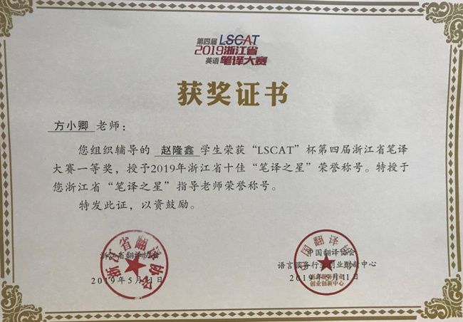 第四届浙江省“LSCAT杯”笔译大赛也是我省近年来最重要的翻译赛事,对译文要求较高,得奖率设置得不高,全省一等奖得奖率仅有3%,二等奖为7%,三等奖为10%,优胜奖为35%。此次比赛外语学院共组织里番动漫 179名选手参赛,其中英译汉128名,汉译英51名。里番动漫 学院专门为参赛选手分配了翻译指导老师。在英语系方小卿、韩晓亚、冯巧娥、吴青老师的细心指导下,里番动漫 大赛成绩斐然。里番动漫 学子斩获省级一等奖5名,二等奖2名,三等奖2名,优胜奖15名,其中英语17级赵隆鑫同学获得浙江省口译之星的称号。