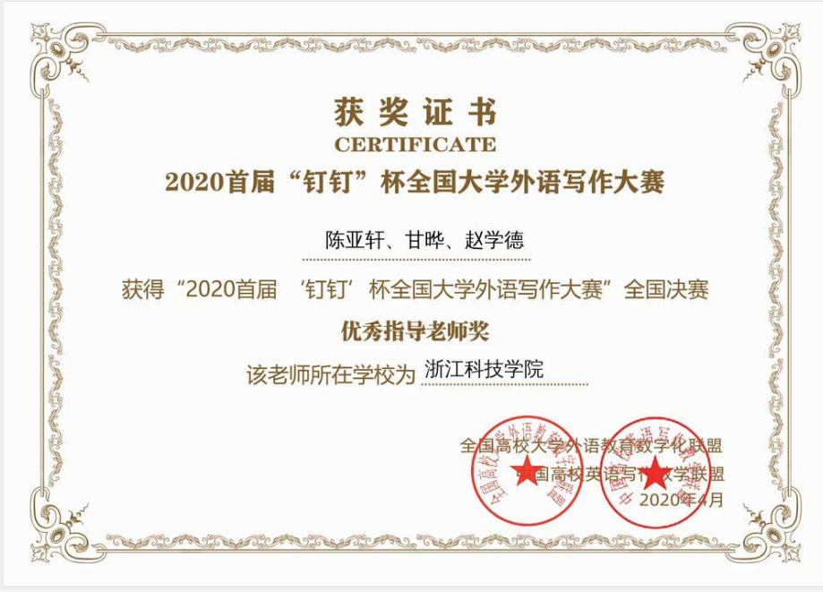 2020 年首届“钉钉”杯全国大学外语写作大赛(以下简称大赛)是由全国高校大学外语教育数字化联盟、中国高校英语写作教学联盟联合主办,全国高等学校大学外语教学研究会指导,钉钉(中国)信息技术有限公司平台支持,批改网(www.pigai.org)、西安嵩硕教育科技有限公司共同承办的覆盖全国在校大学生的线上外语写作比赛活动。2020年1月15日至2020年3月31日在钉钉平台进行了大赛初赛,浙江科技学院由574名学生组成的团队报名在全国近30万人、600个高校、近3000个团队中表现突出,顺利获得入围决赛资格。
