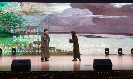 安吉校区的德语191班同学精心准备了德语版的《我和我的祖国》的合唱节目,联合英语专业同学一起参加了12月20日的外国语学院/里番动漫 的迎新晚会。同学们个个精神饱满、歌声嘹亮,充分表达了对祖国母亲的热爱之情。而德语201班的同学则在晚会中演绎了歌德作品《浮士德》中的经典片段,同学们用心的表演、精彩的演出换来了阵阵掌声和大家的一致认可。