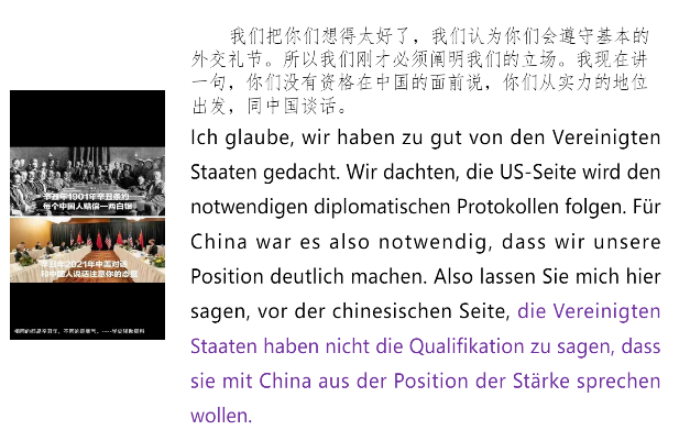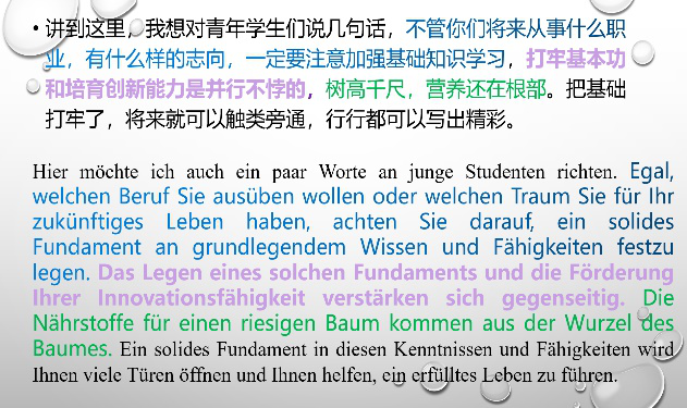 教师结合当下时事,引导学生们学习德语表达的同时,使学生了解中国道路中国成就,体会制度自信文化自信。