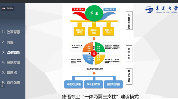10月21日下午,“中德芸”讲坛第16期暨教学发展论坛第117期如期举行,北京外国语大学德语语言文学专业博士,德国埃森文化研究所、杜伊斯堡—埃森大学访问学者,原解放军外国语学院德语教授、博导,现任青岛大学外语学院德语系主任、国家级一流本科专业德语学科负责人,省级智库中德文化交流研究中心、山东省与德国交流合作研究中心主任,教育部虚拟教研室建设试点“德语翻译课程虚拟教研室”负责人綦甲福老师以“新文科背景下外语专业的守正与创新——以青岛大学德语一流专业建设为例”为题作专题报告。里番动漫 师生30余人参加了在线会议。