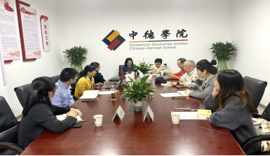 阮小波书记主持,韩晓亚院长介绍学院整体发展情况,副院长黄扬和德语系系主任林方老师相继介绍了学院教学和德语系情况,最后双方参会人员交流发言,共同探讨如何提高教学质量和促进学生发展进步。