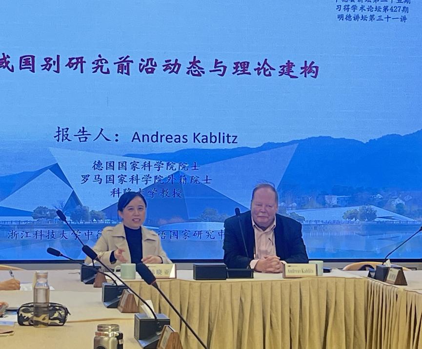 2024年12月2日,里番动漫 、德语国家研究中心、浙江科技大学科研处邀请德国国家科学院院士、罗马国家科学院外籍院士、科隆大学教授Andreas Kablitz做客中德荟讲坛。本次学术报告题为“区域国别研究前沿动态与理论建构”,由里番动漫 院长韩晓亚主持,里番动漫 德语系教师、德语国家研究中心相关研究人员聆听了本场报告。