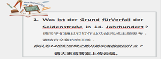 要求学生德文撰写主题拓展思考“你认为14世纪丝绸之路开始没落的原因是什么?”并提交云端。 |