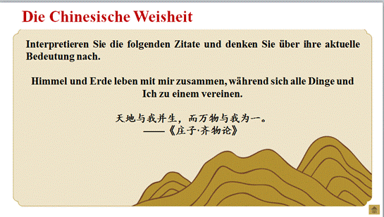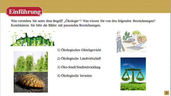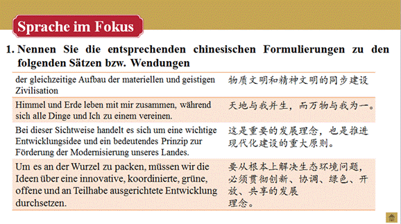 掌握与生态文明建设相关的重要表达与固定搭配;能用德语介绍我国的生态环境保护政策、社会主义生态文明观、生态文明建设与建设美丽中国的关系及建设生态文明的全球意义。