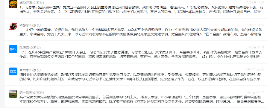 通过集体分享,党员教师们对自己的学习情况有了更多的思考,对党史学习教育的总体要求有了更深刻的认识,有利于党史学习教育的持续性深入新和有效性开展。